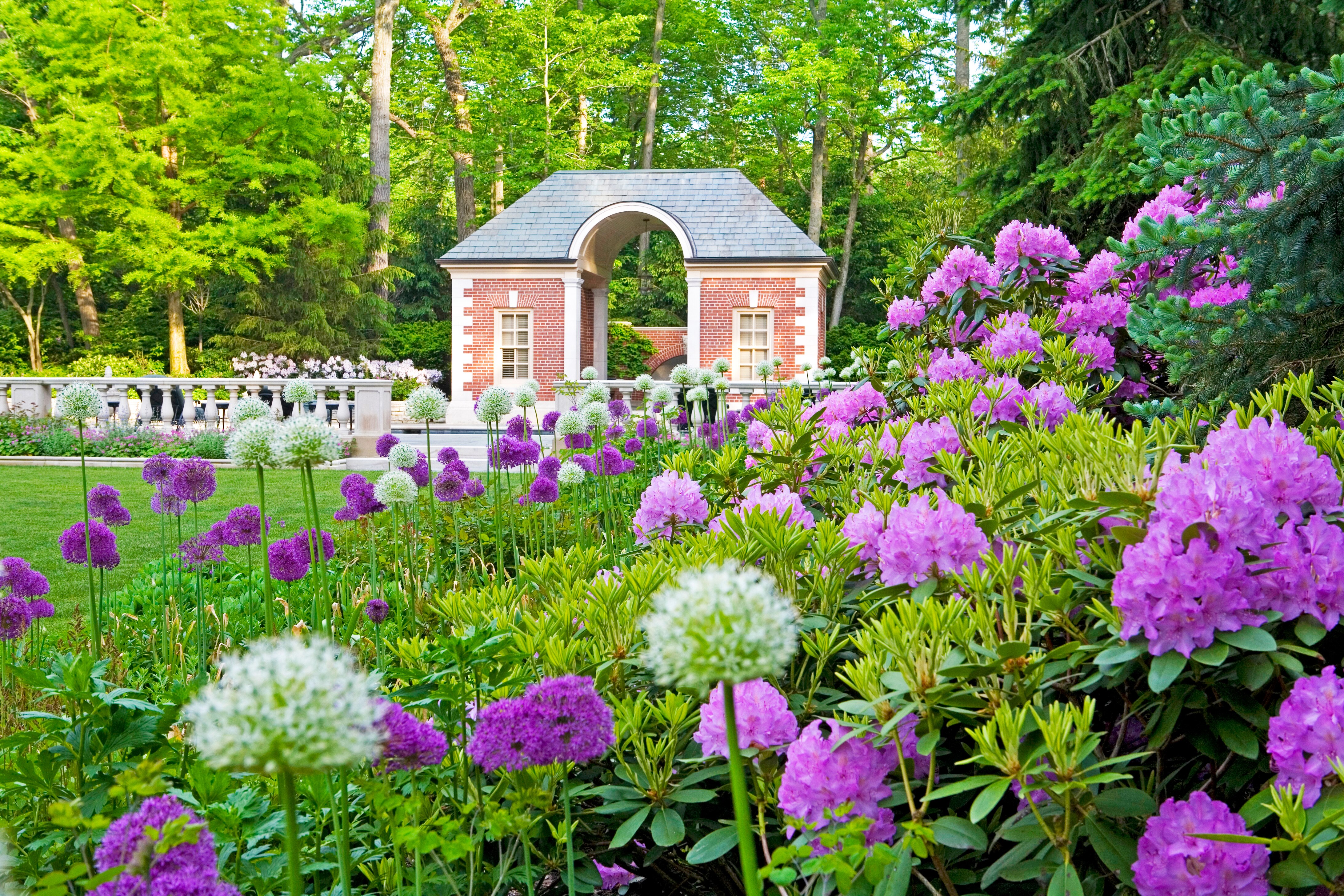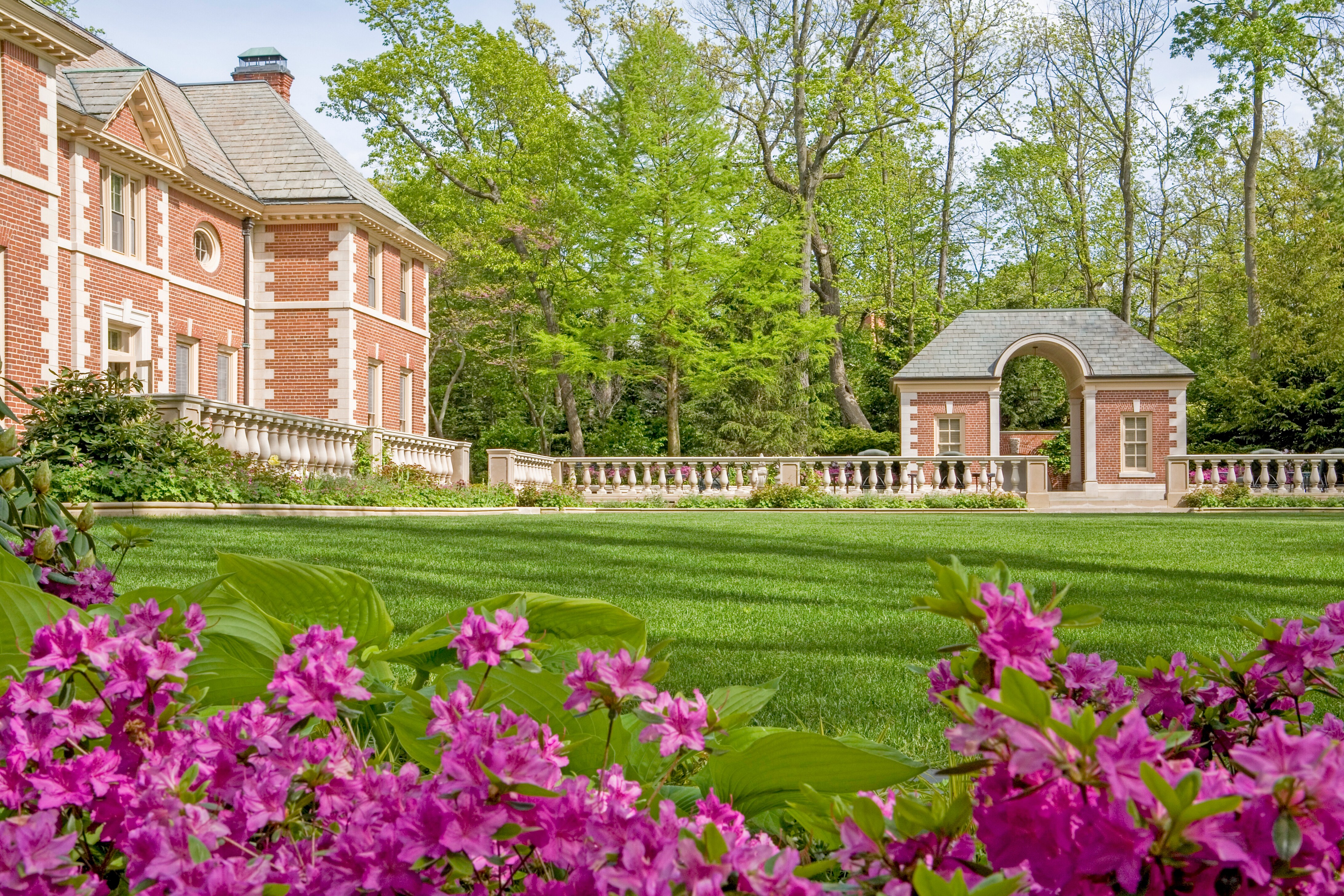 This petite pool house serves as a beautifully crafted outbuilding that reflects the architectural style of the main home. Designed with detail and sophistication, it combines practicality and elegance, featuring pool storage and a changing room. The structure showcases exquisite architectural details, including brick, limestone accents, and a slate roof, all contributing to its timeless beauty and seamless integration with the surrounding property.