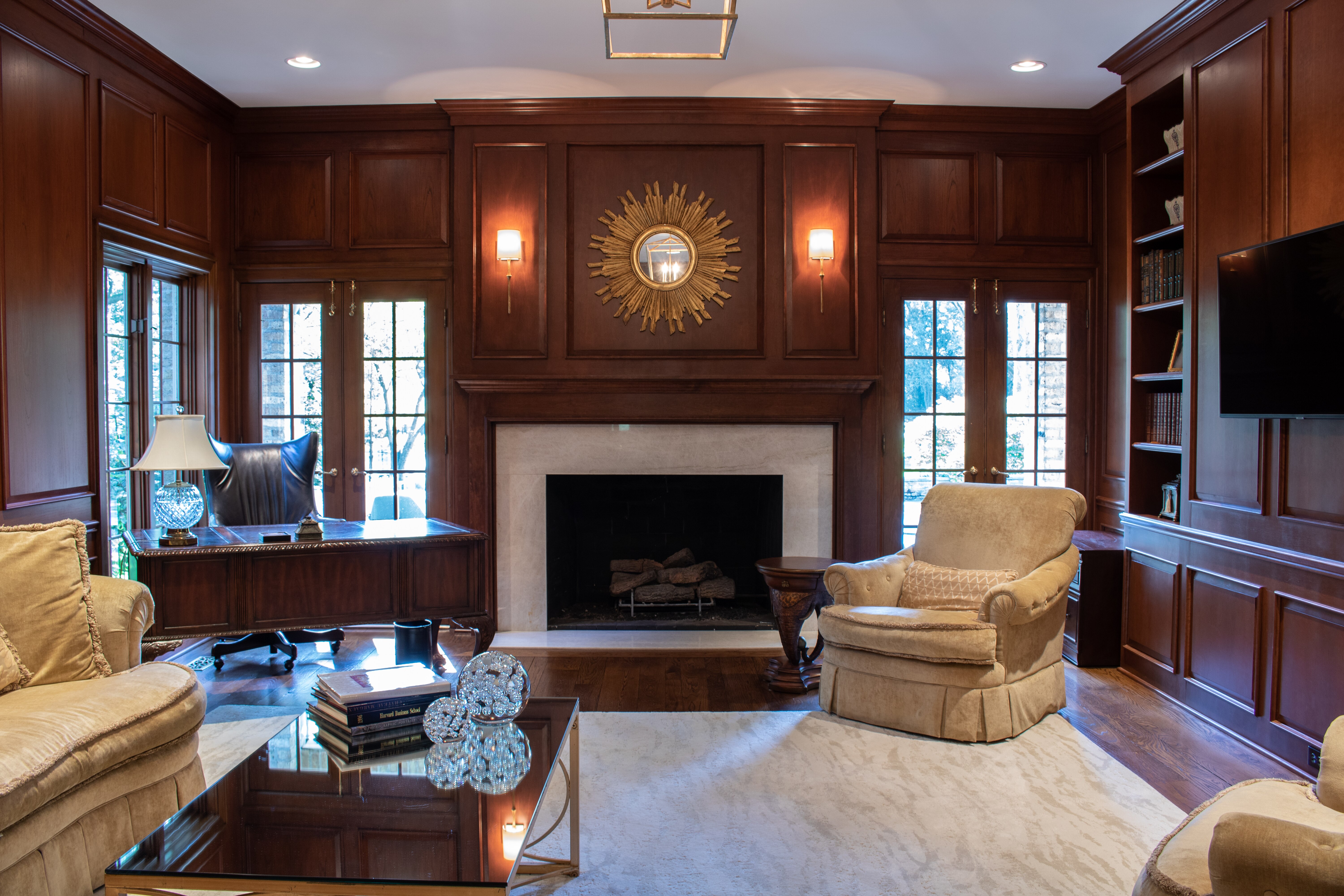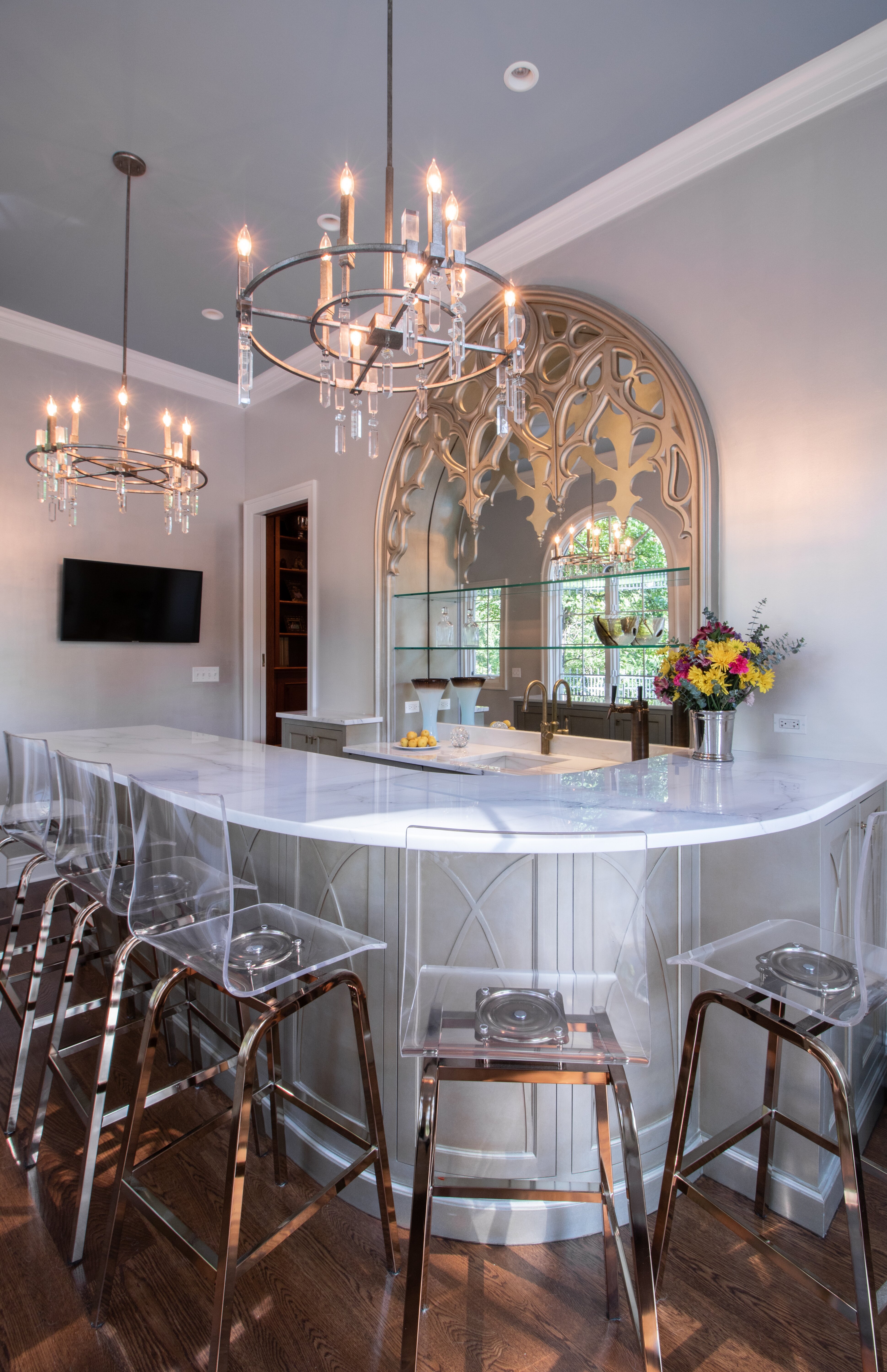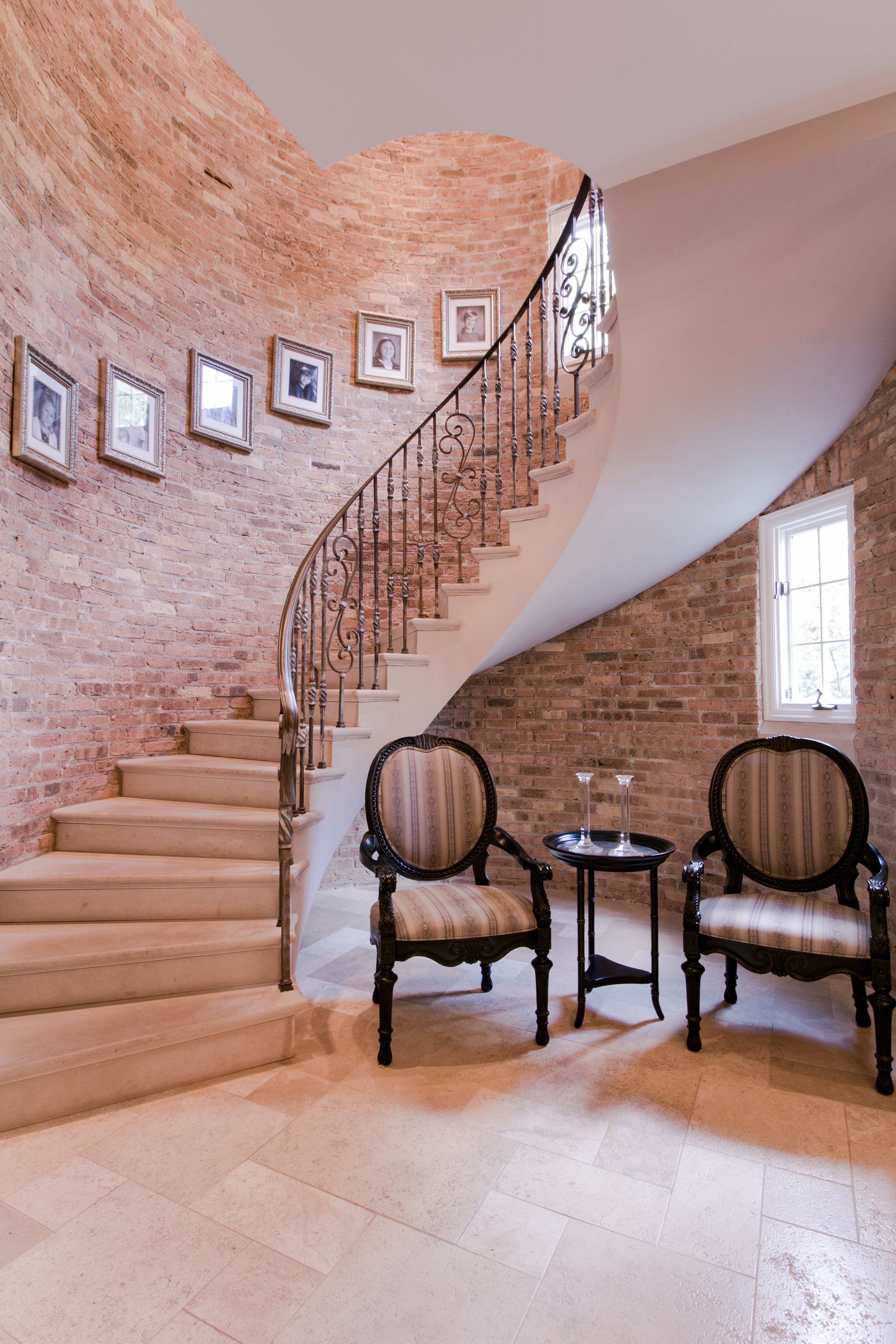 Our client wanted to put her personal touch on this French-inspired home. The new limestone staircase takes advantage of the elegantly shaped turret. The library fireplace got a much needed make-over, and we opened up the room itself to the entry foyer for a direct view from the front door. We had some fun designing an intricately detailed arch backdrop and the new home bar. Our client's refined taste for fixtures and finishes highlights the newly designed master bathroom.