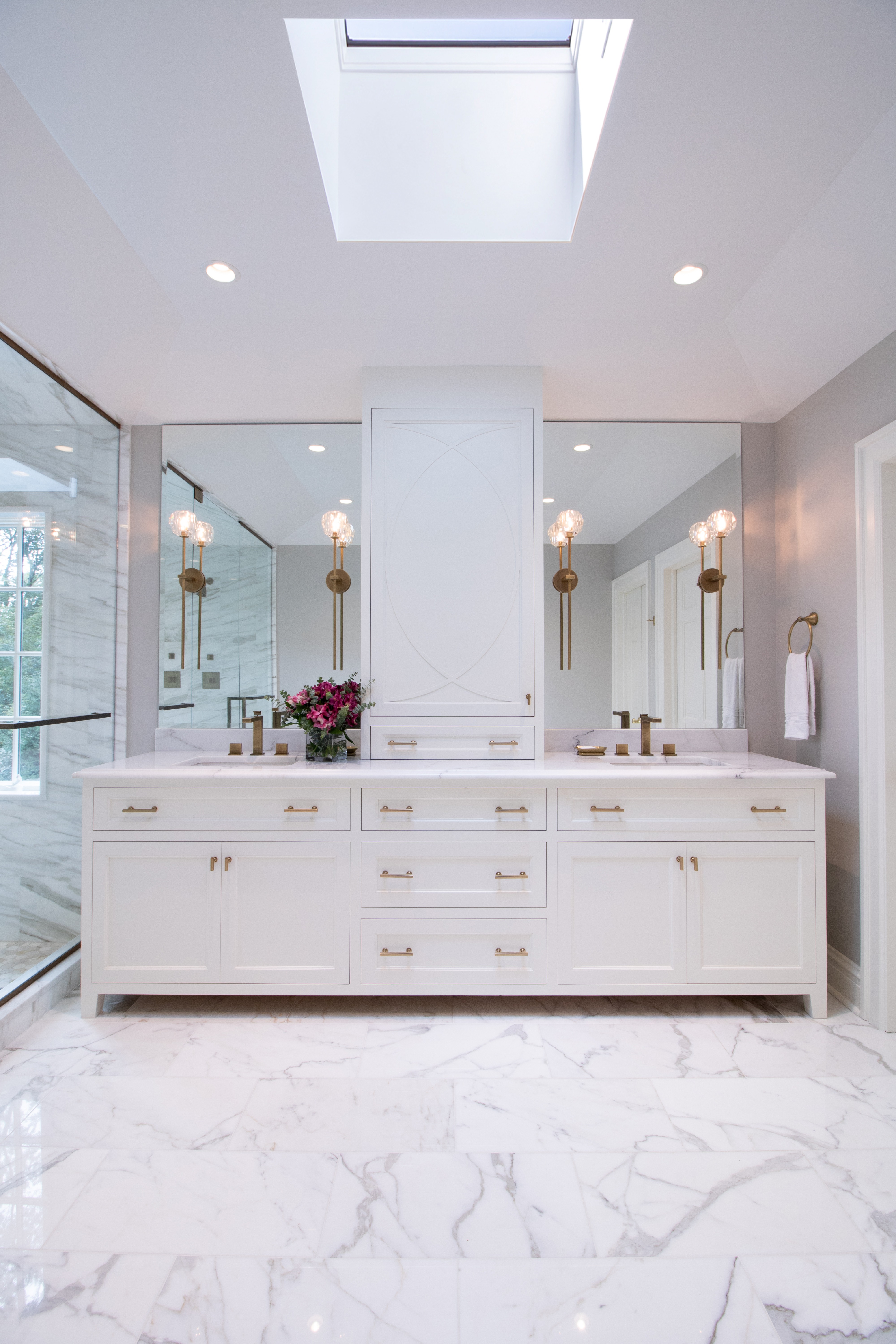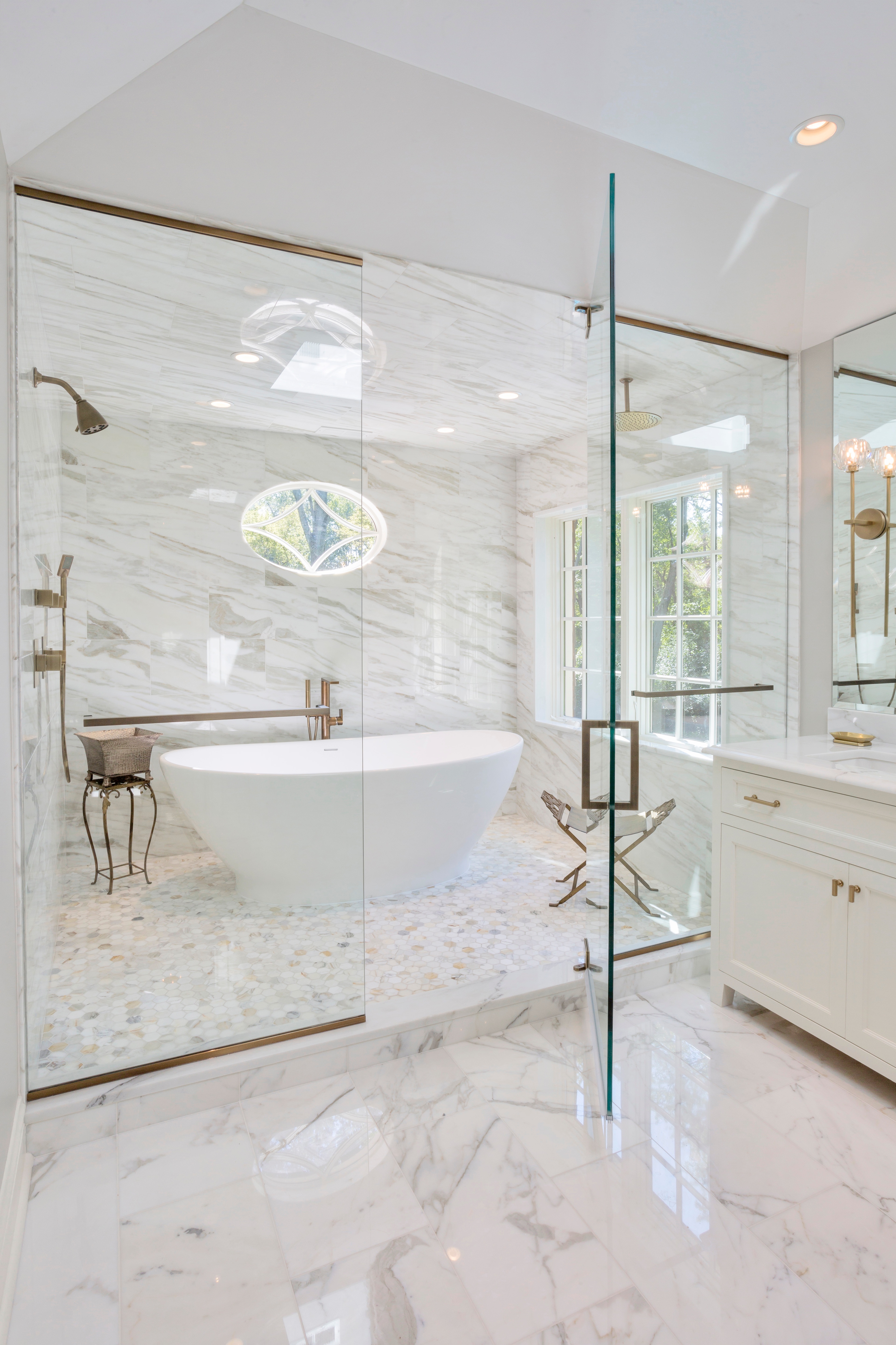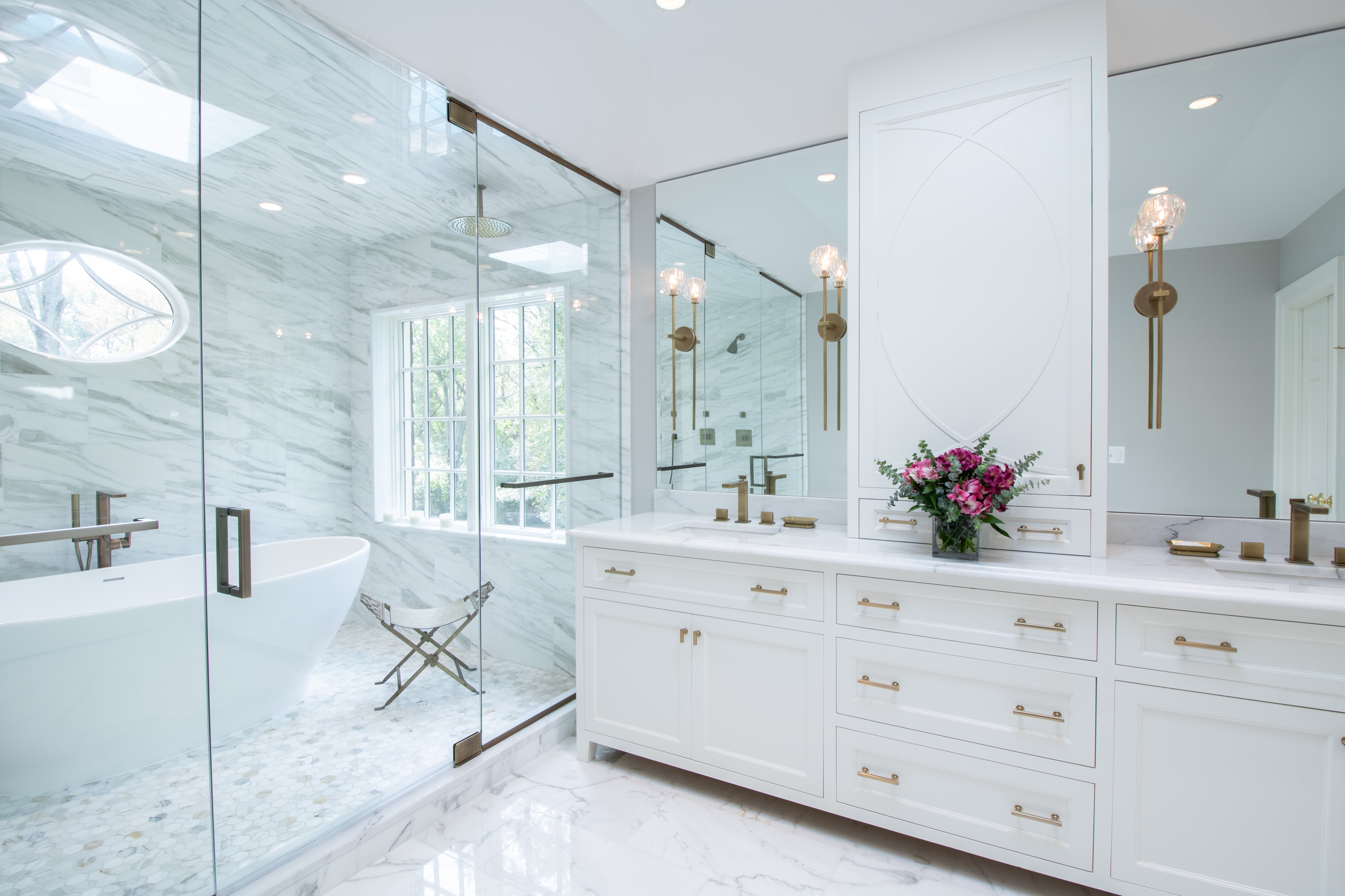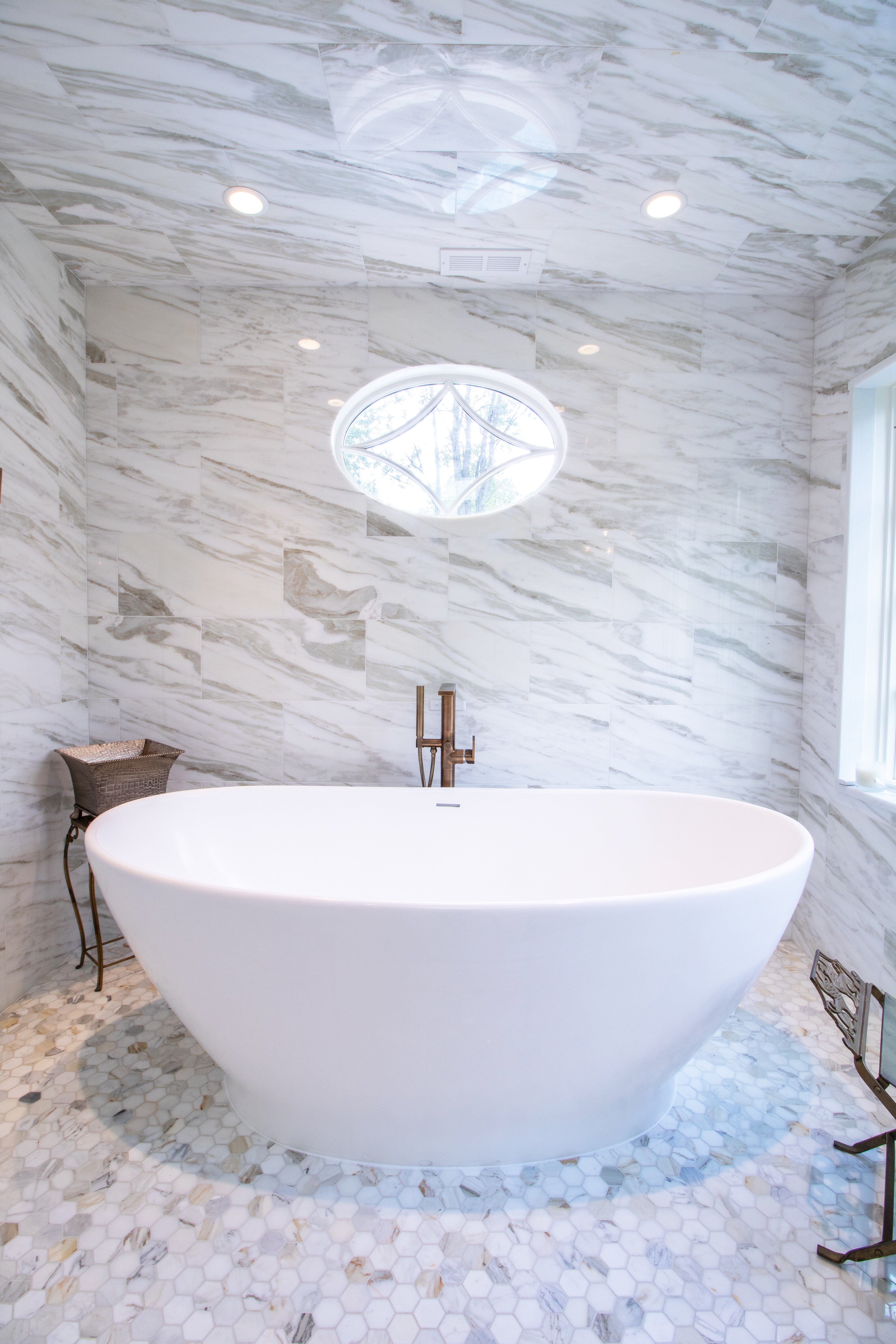 Our client wanted to put her personal touch on this French-inspired home. The new limestone staircase takes advantage of the elegantly shaped turret. The library fireplace got a much needed make-over, and we opened up the room itself to the entry foyer for a direct view from the front door. We had some fun designing an intricately detailed arch backdrop and the new home bar. Our client's refined taste for fixtures and finishes highlights the newly designed master bathroom.