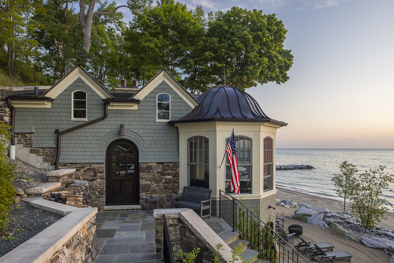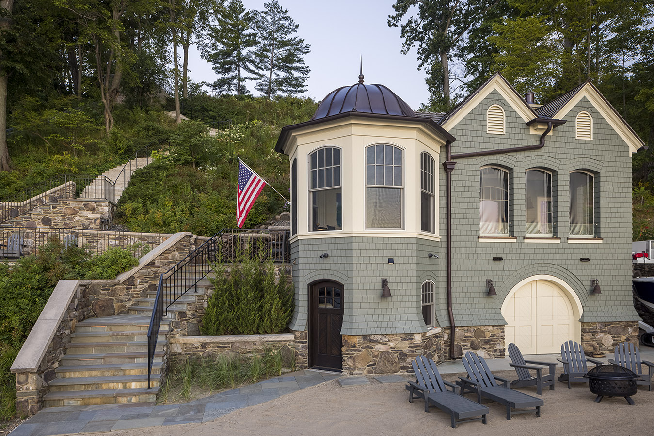 Nestled amongst mature trees and overlooking Lake Michigan, this new Shingle Style home exemplifies the cozy nature of this historic architectural style. Rustic stone walls are complemented by earth-toned shingles, and the copper accents add a touch of warmth. The floor plan layout was designed to embrace the beautiful land and take advantage of the spectacular views. Interior spaces reflect the outdoors with the use of natural materials such as a variety of wood species and a multitude of different stones. To top off this gracious estate property, a new boat house down on the shores of Lake Michigan is a quaint retreat for the homeowner & guests. Its architectural style matches that of the main house, complete with a turret overlooking the spectacular view of the water and shoreline.