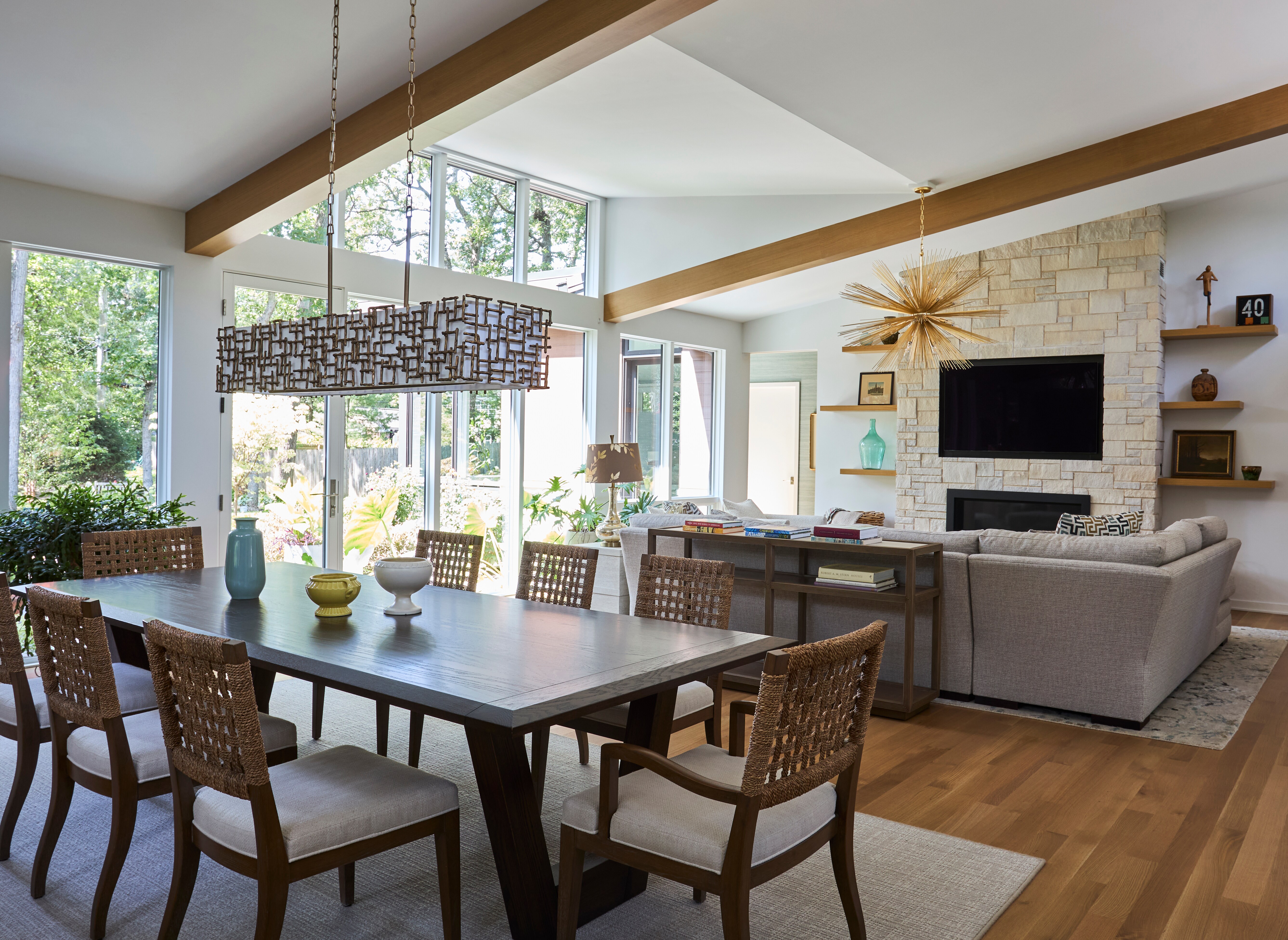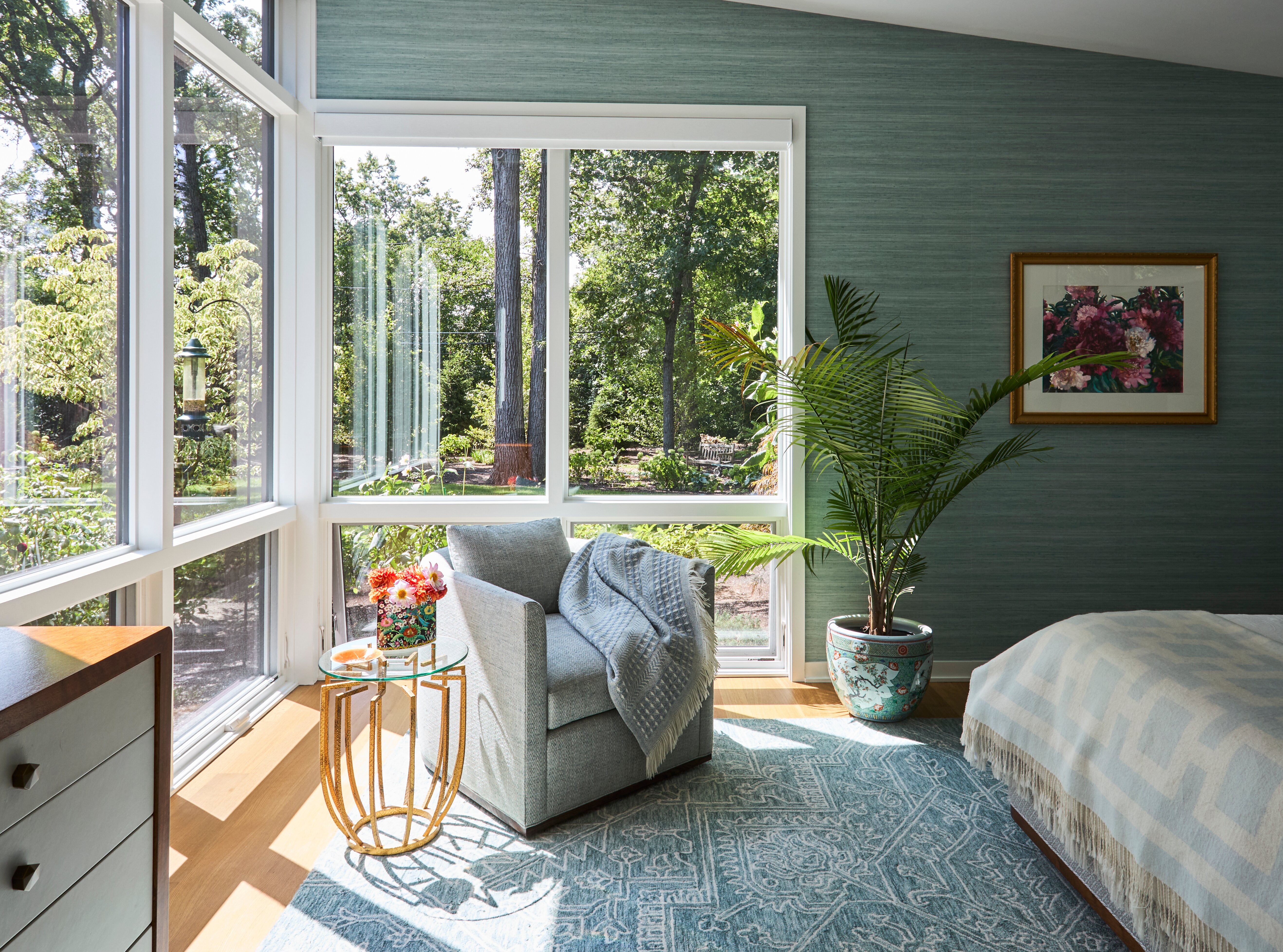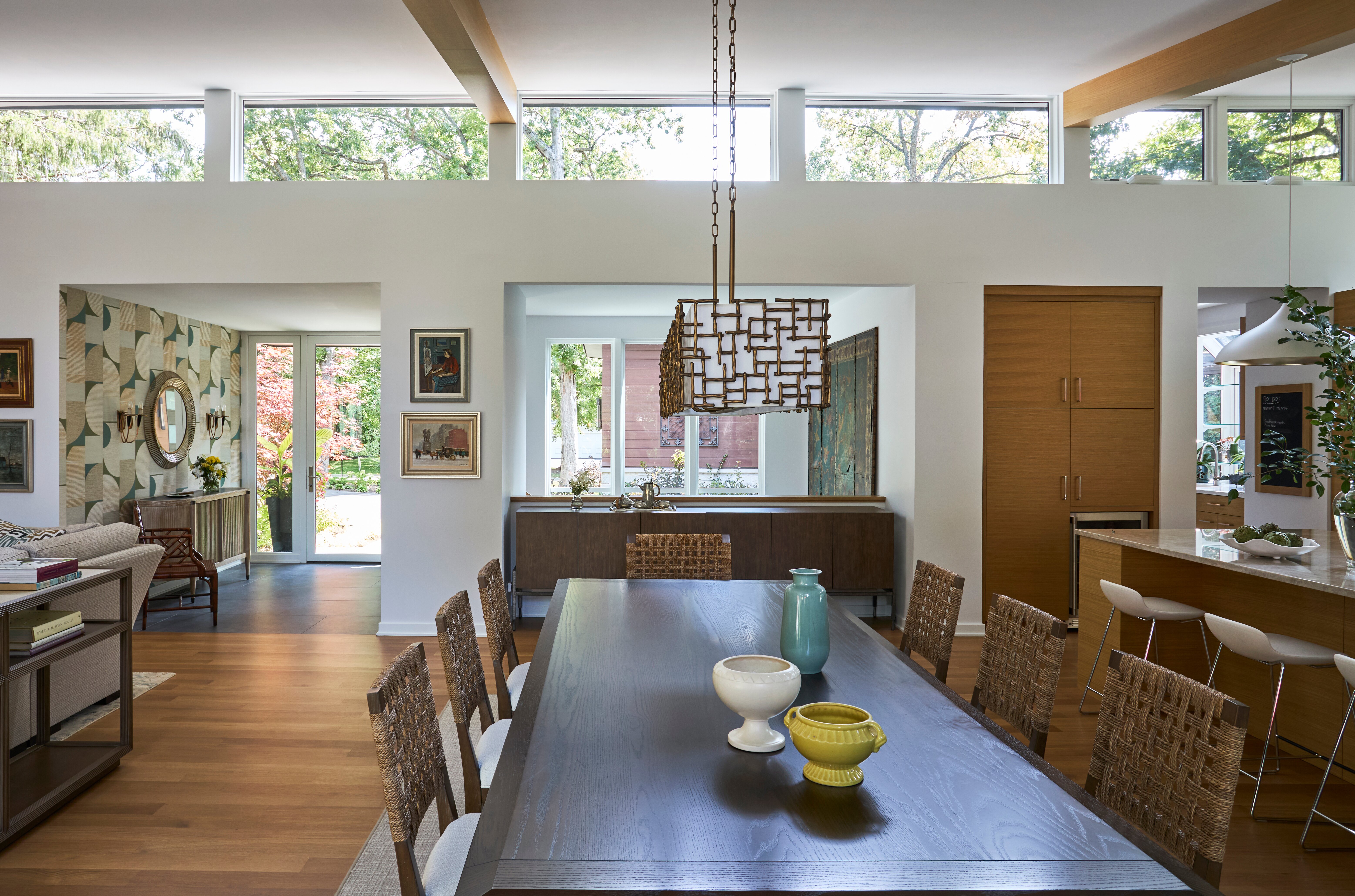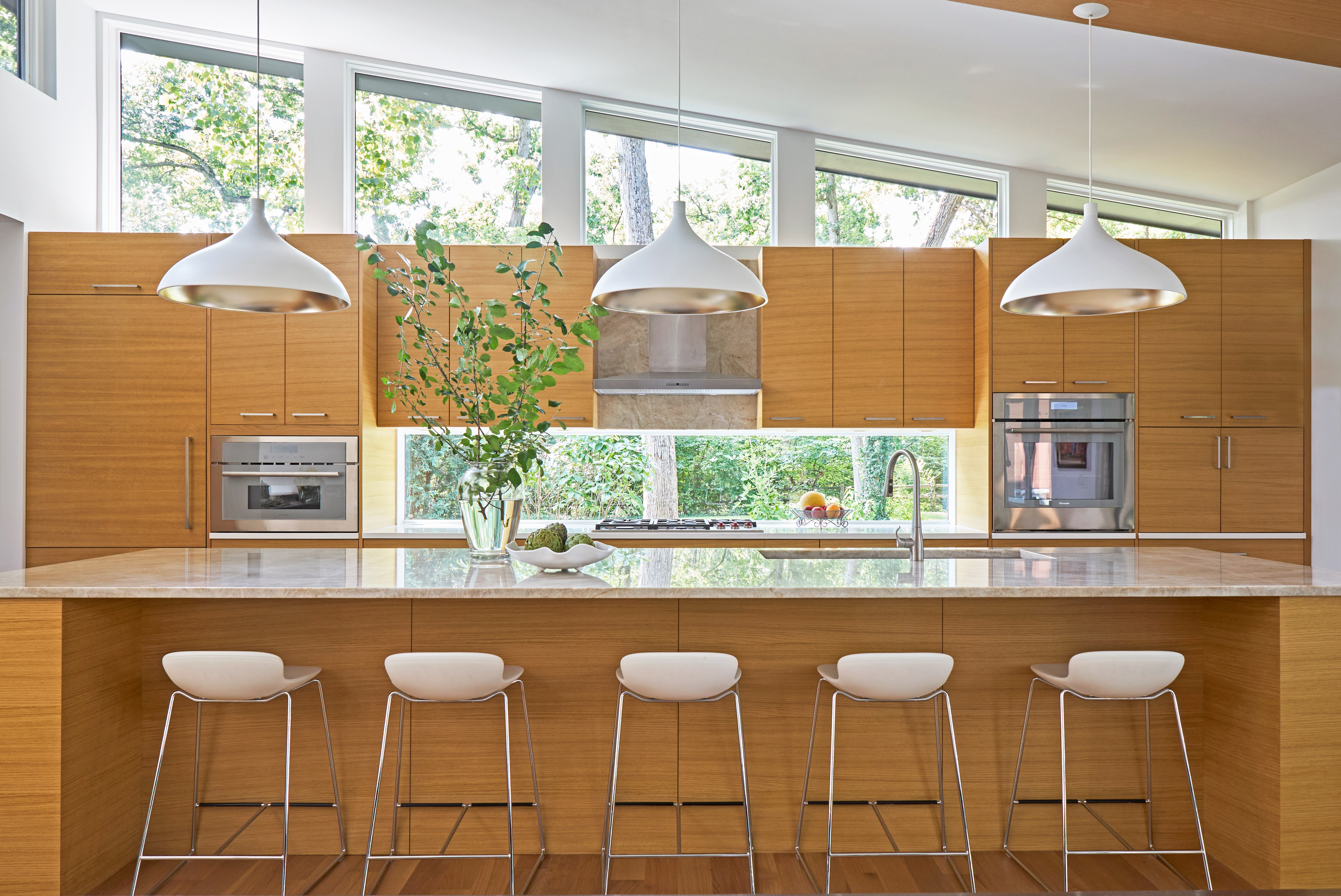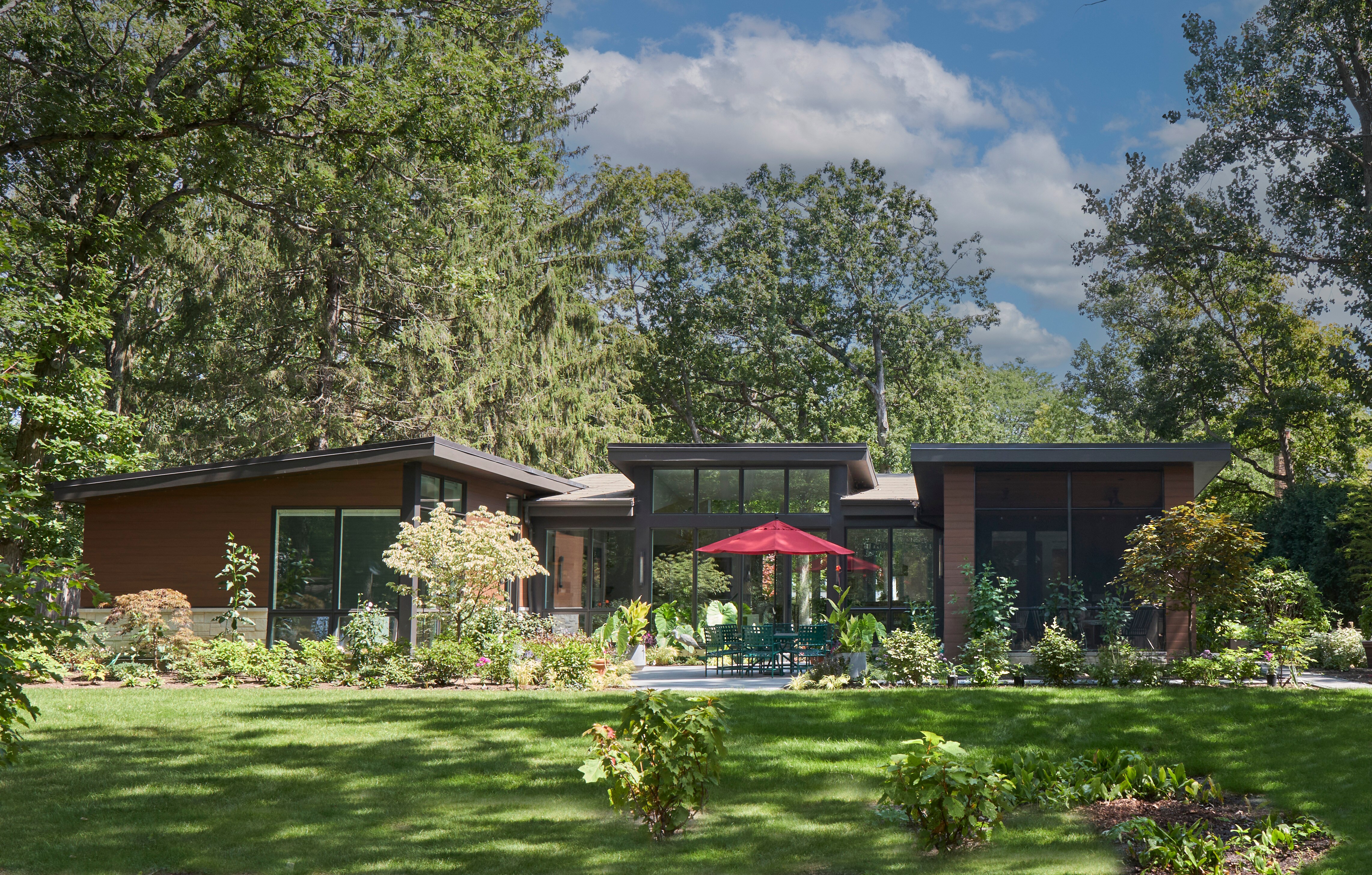 This contemporary home is a perfect fusion of modern aesthetics and lush greenery. We collaborated with our client/landscape designer to create a bright and inviting sanctuary that welcomes nature. Floor to ceiling windows, and clerestory windows create breathtaking living spaces and a light-filled atmosphere. Modern building and millwork elements are mixed with natural textures and colors to bring the outdoors inside. The large screened porch captures summer breezes, while the sheltered courtyard patio keeps the homeowners bathed in winter light to keep them warm.