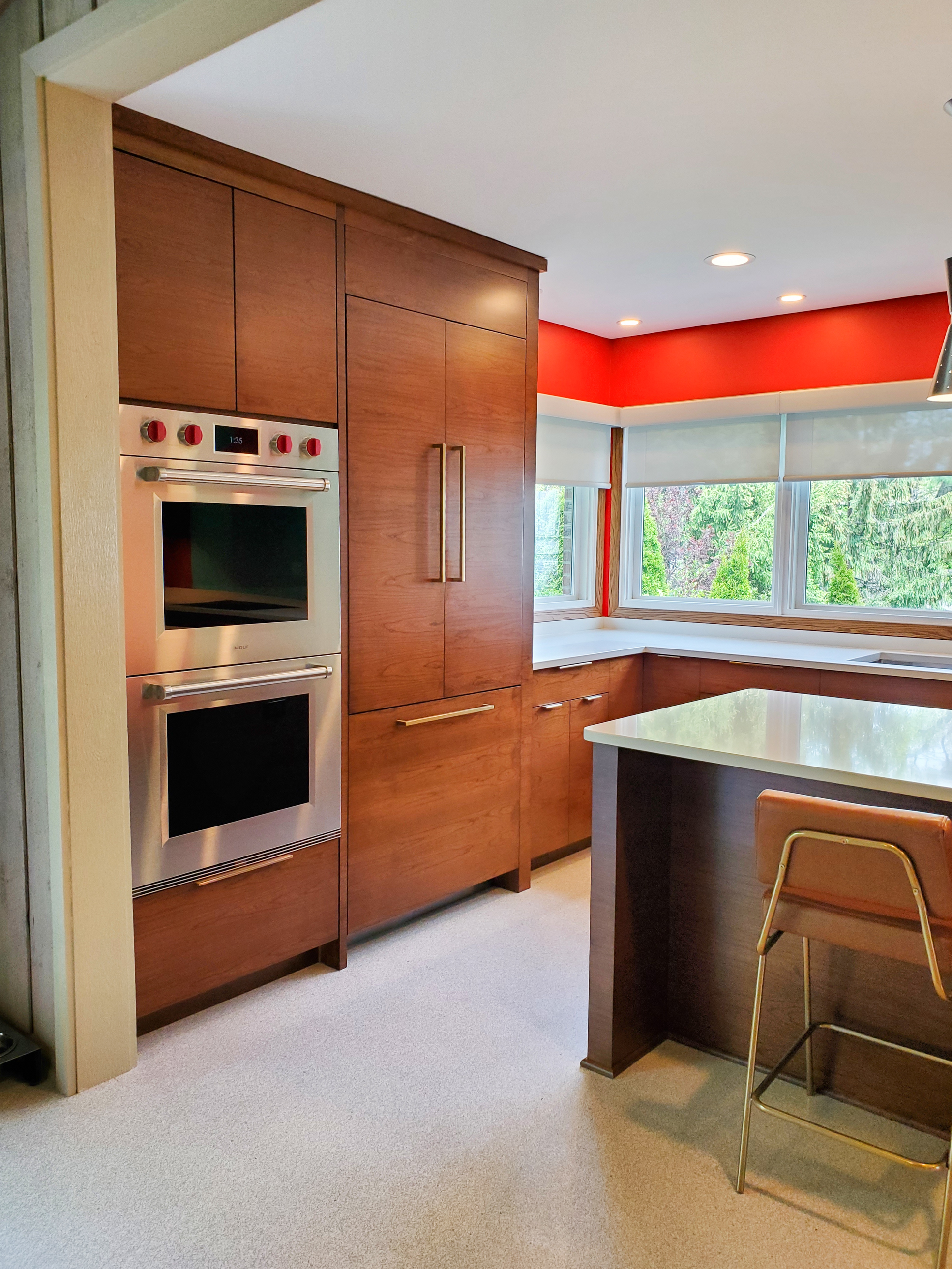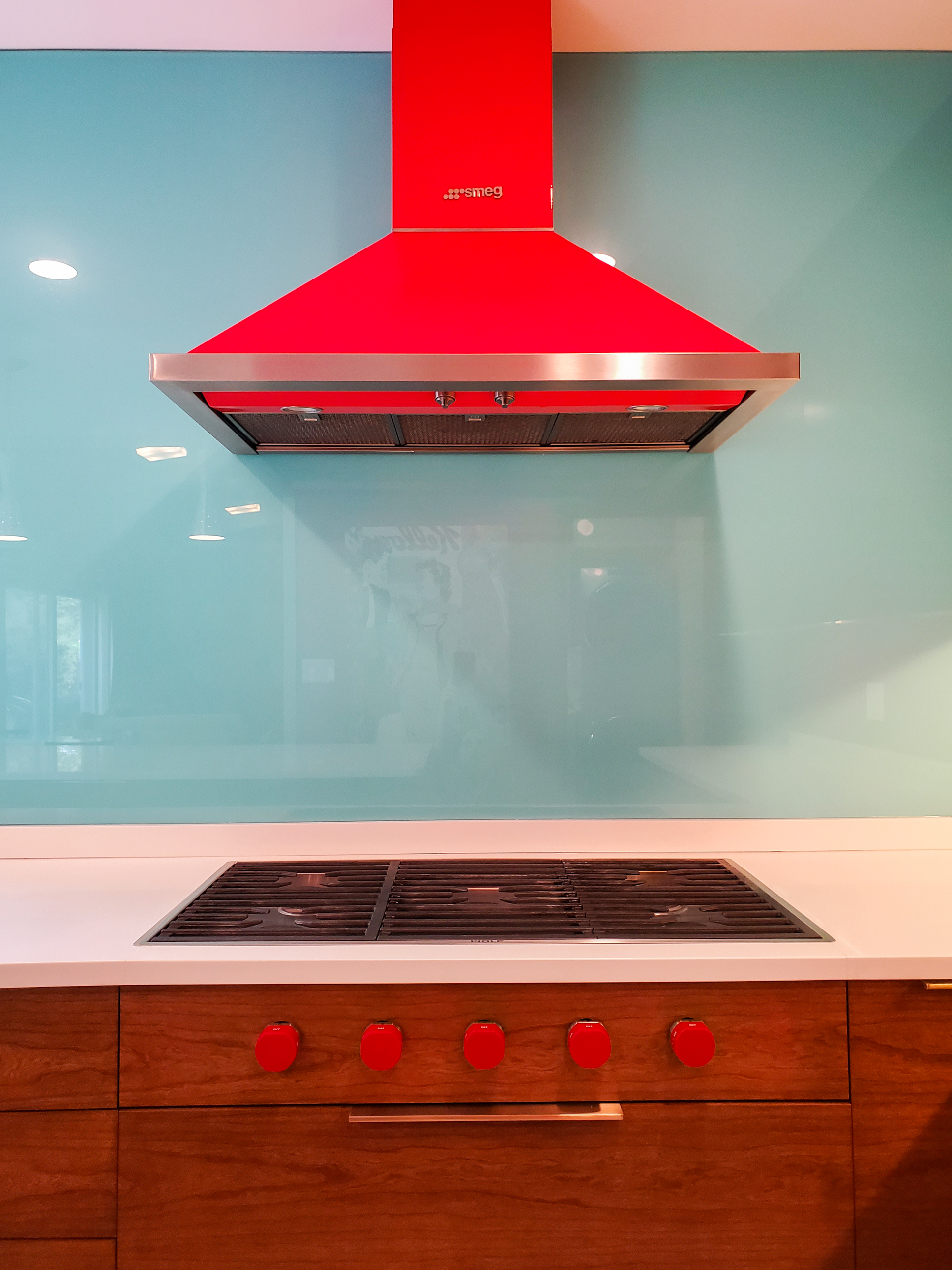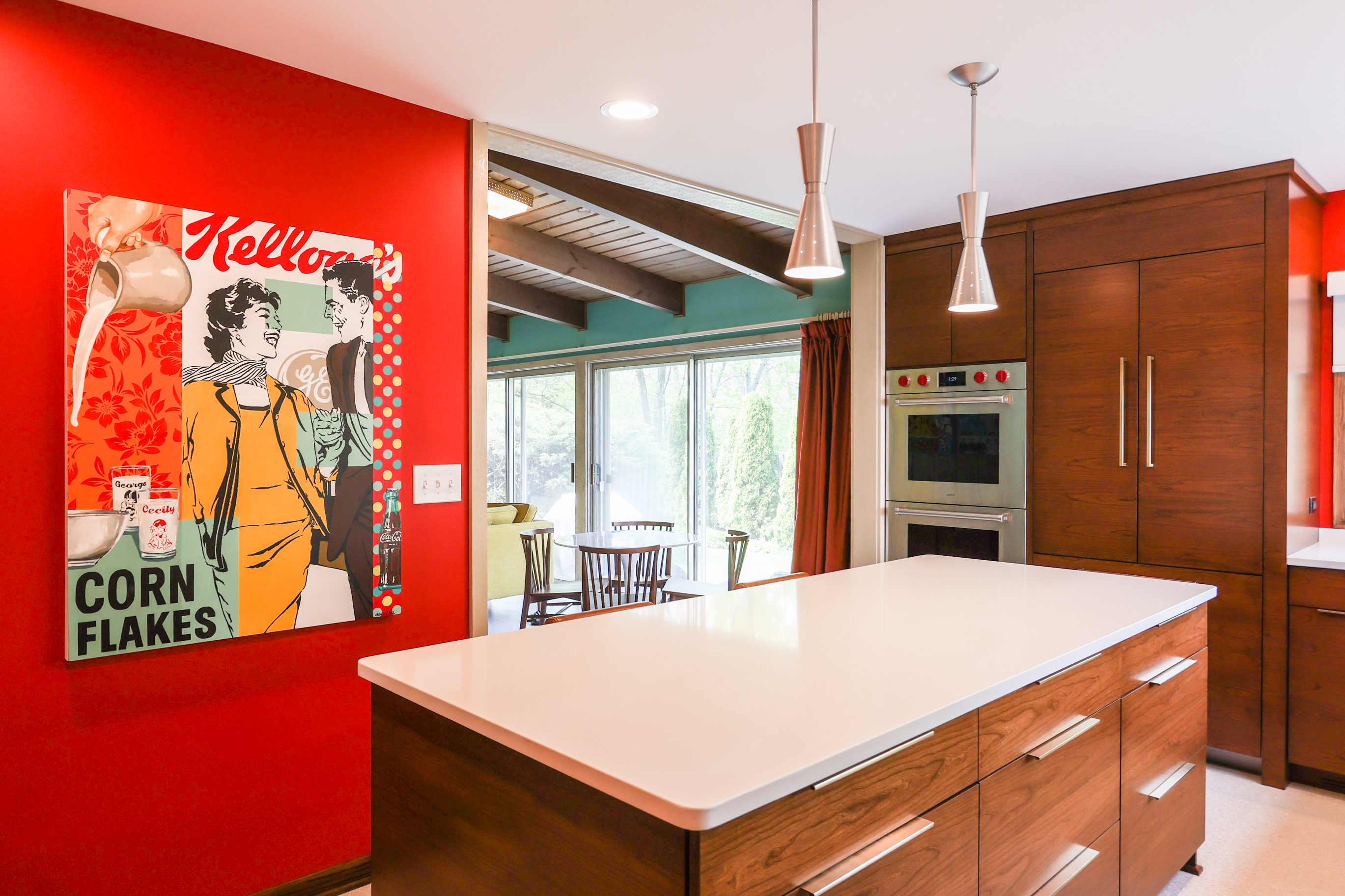 Bold colors bloom in this retro interior renovation. In keeping with free expression and unconventional thinking of the 1960’s,the homeowner’s of this ranch house wanted to revive and expand their kitchen/laundry and make a statement with a modern design that reflects the spirit of their home’s time period. The layout of the new kitchen and laundry room lends itself to today’s domestic challenges, while still being comfortable and functional. We widened the opening from the family room to the kitchen, making the connection between the two spaces much more open. The minimalist design and materials selections are complemented by the owner’s collection of pop culture artwork, making these spaces practical and fun.