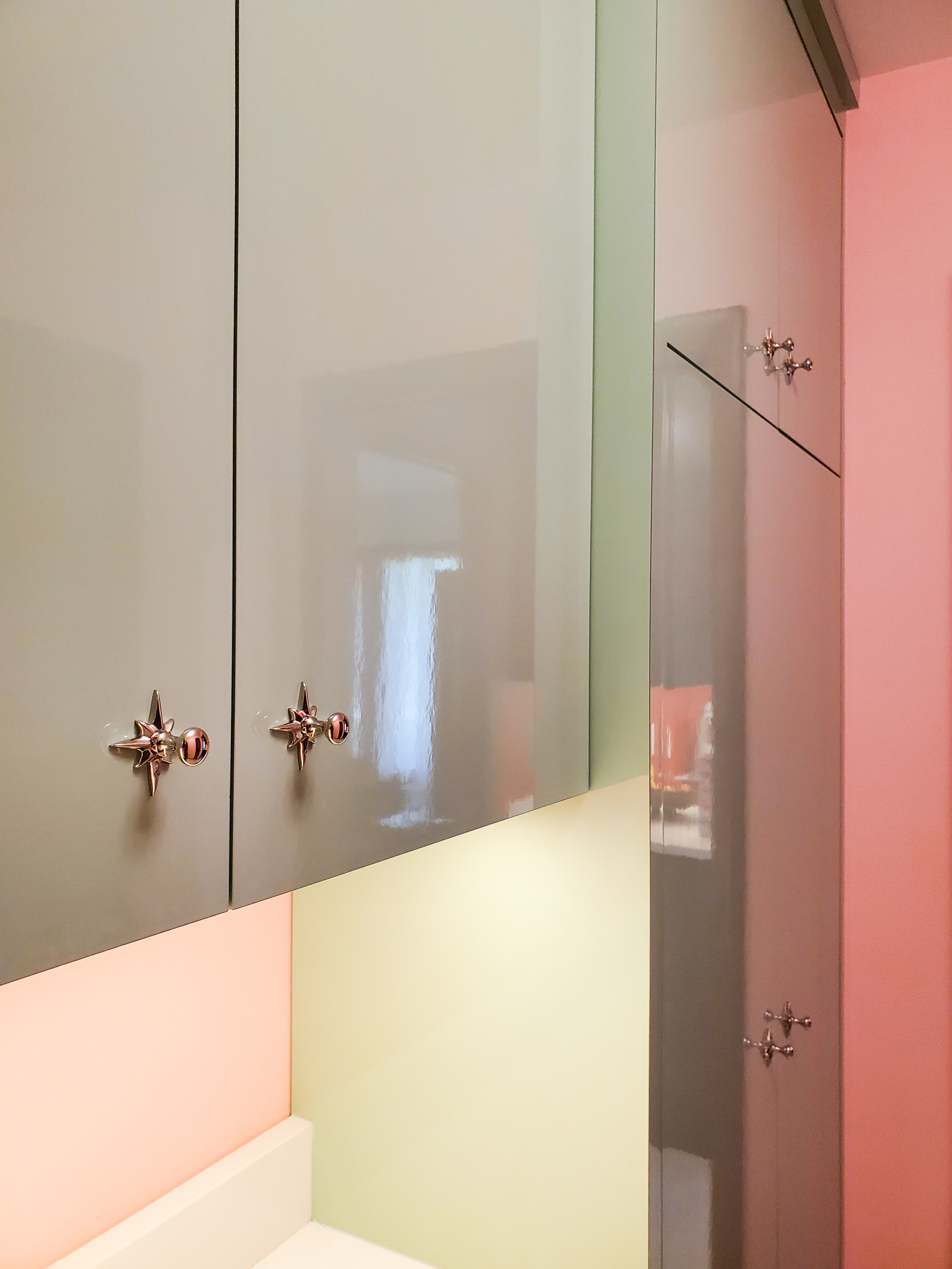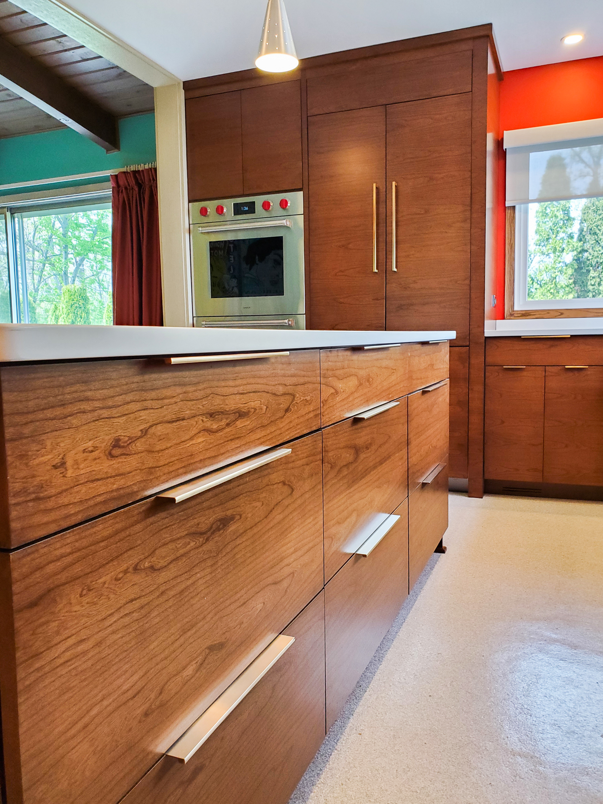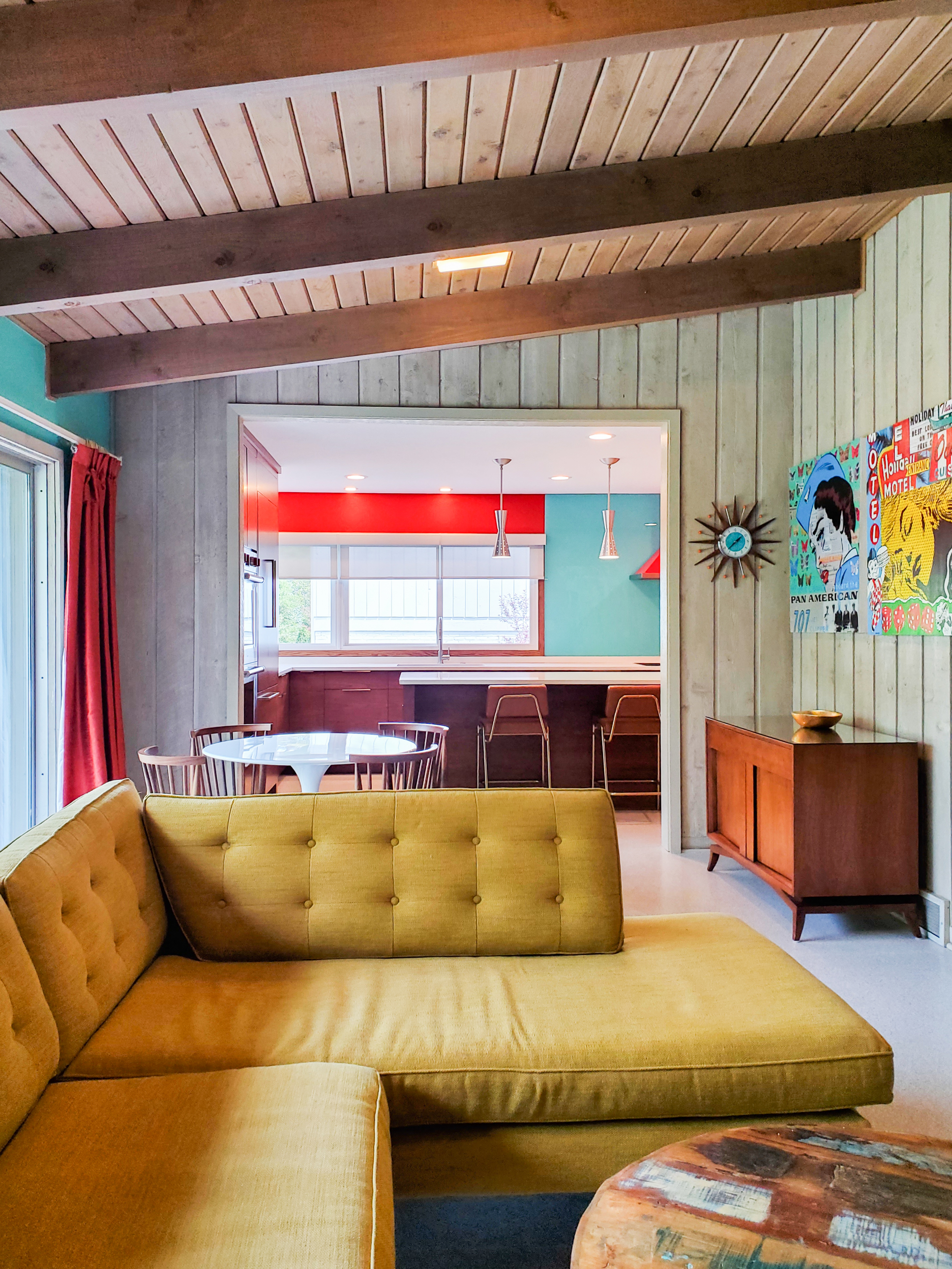 Bold colors bloom in this retro interior renovation. In keeping with free expression and unconventional thinking of the 1960’s,the homeowner’s of this ranch house wanted to revive and expand their kitchen/laundry and make a statement with a modern design that reflects the spirit of their home’s time period. The layout of the new kitchen and laundry room lends itself to today’s domestic challenges, while still being comfortable and functional. We widened the opening from the family room to the kitchen, making the connection between the two spaces much more open. The minimalist design and materials selections are complemented by the owner’s collection of pop culture artwork, making these spaces practical and fun.
